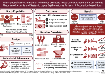 Vancouver (March 18, 2026)— A new study led by a research trainee and scientists at Arthritis Research Canada found that patients with rheumatoid arthritis (RA) and systemic lupus erythematosus (SLE) who take antimalarial medications such as hydroxychloroquine are less likely to be hospitalized.